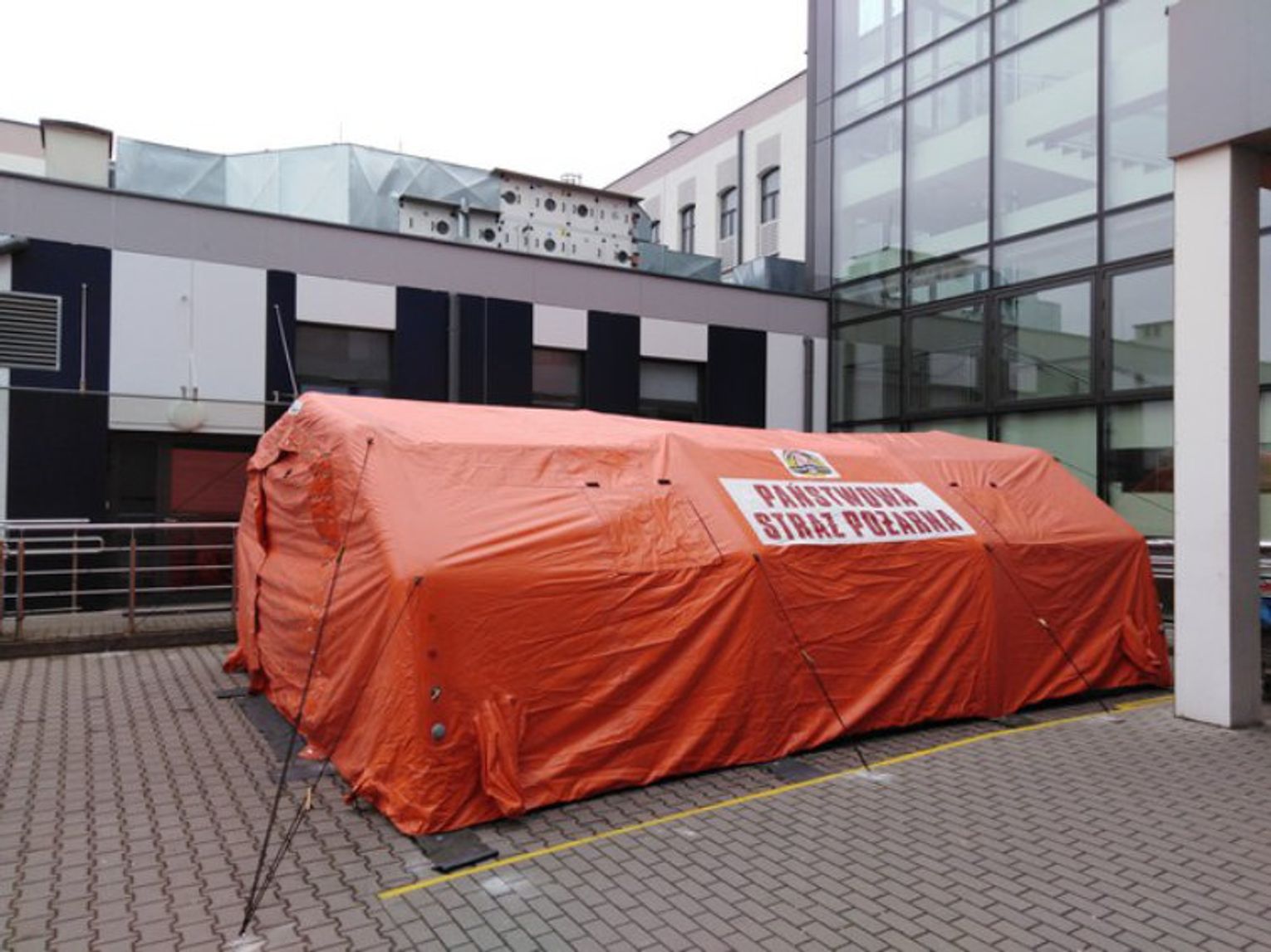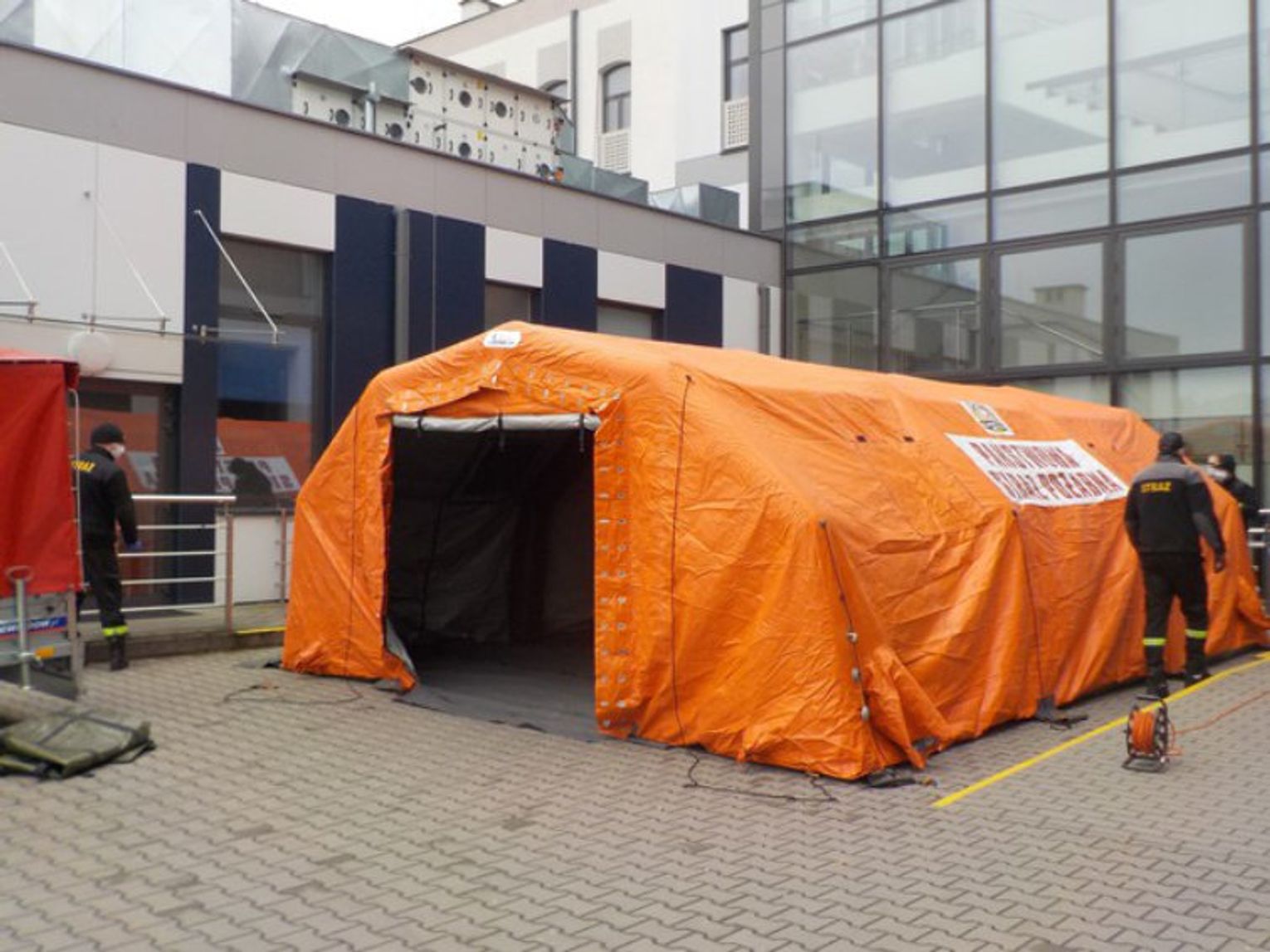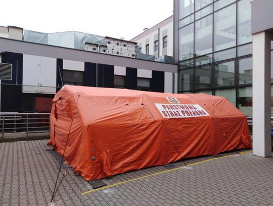Przed wejściem głównym do Zespołu Opieki Zdrowotnej przy ul. Wiejskiej brodniccy strażacy rozstawili dwa namioty – pneumatyczny oraz stelażowy, które będą stanowiły polową izbę przyjęć. W namiotach będzie prowadzona wstępna segregacja osób potencjalnie podejrzanych zarażeniem koronawirusem SARS CoV-2.