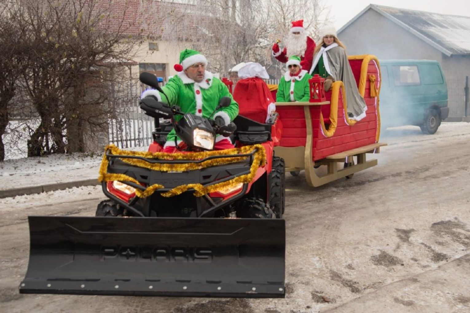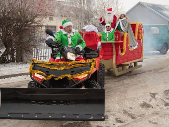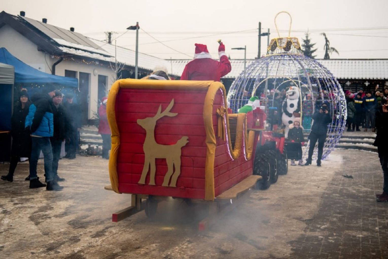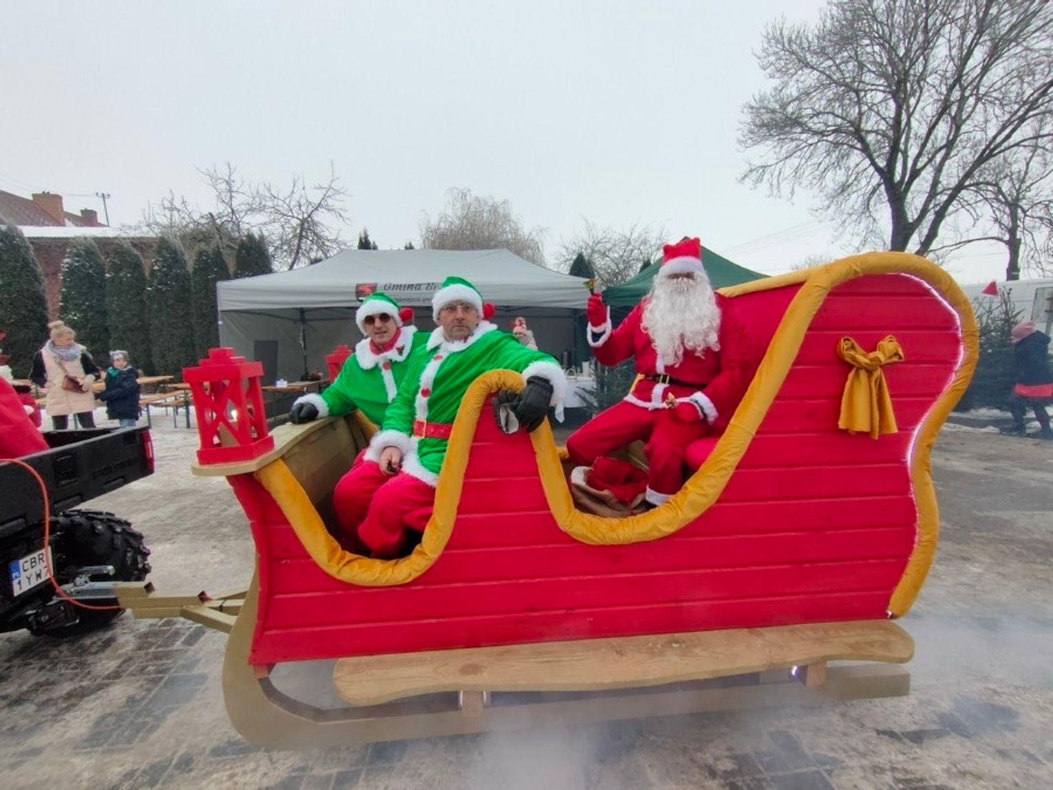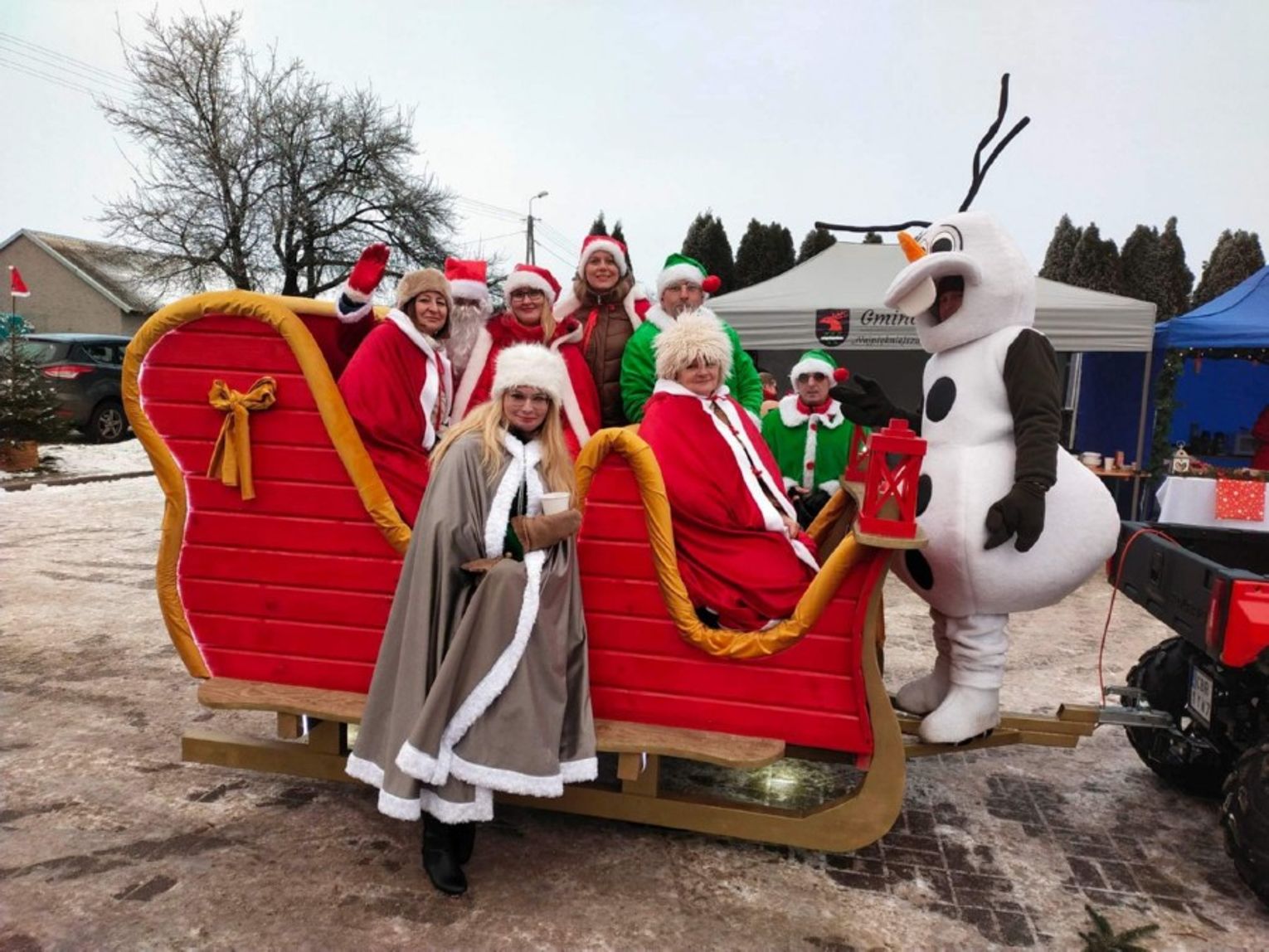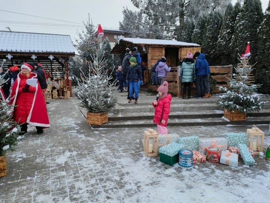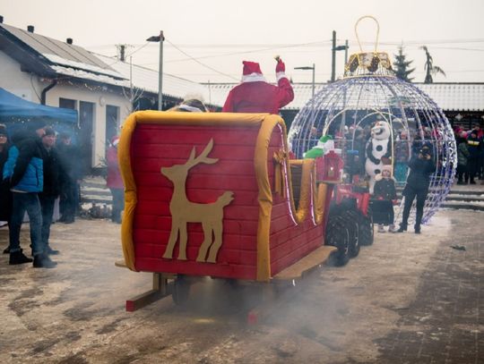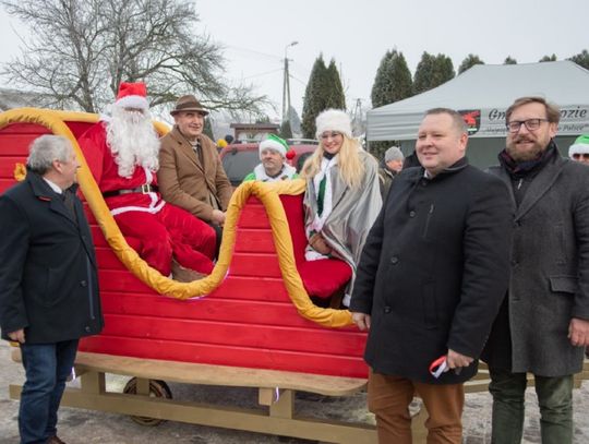 Ogromną atrakcją jarmarku był przyjazd Mikołaja, który w tym roku oprócz dwóch Elfów zabrał na sanie również panią wójt. A cóż to były za sanie – istny majstersztyk. Wybite czerwonym aksamitem, ze złotymi ozdobami, sunęły w oparach białego dymu, niczym królewski powóz z bajki. Z sań wyłoniła się pani wójt jako srebrna Śnieżynka, Mikołaj i dwa Elfy. Dzieciaczki wraz z rodzicami otoczyły pojazd ciasnym kordonem, a Mikołaj nie szczędził im słodyczy. Było dużo śmiechu i pamiątkowych zdjęć. Po targowisku przechadzał się także Olaf z Krainy Lodu, który rozdawał świąteczne cukierki.