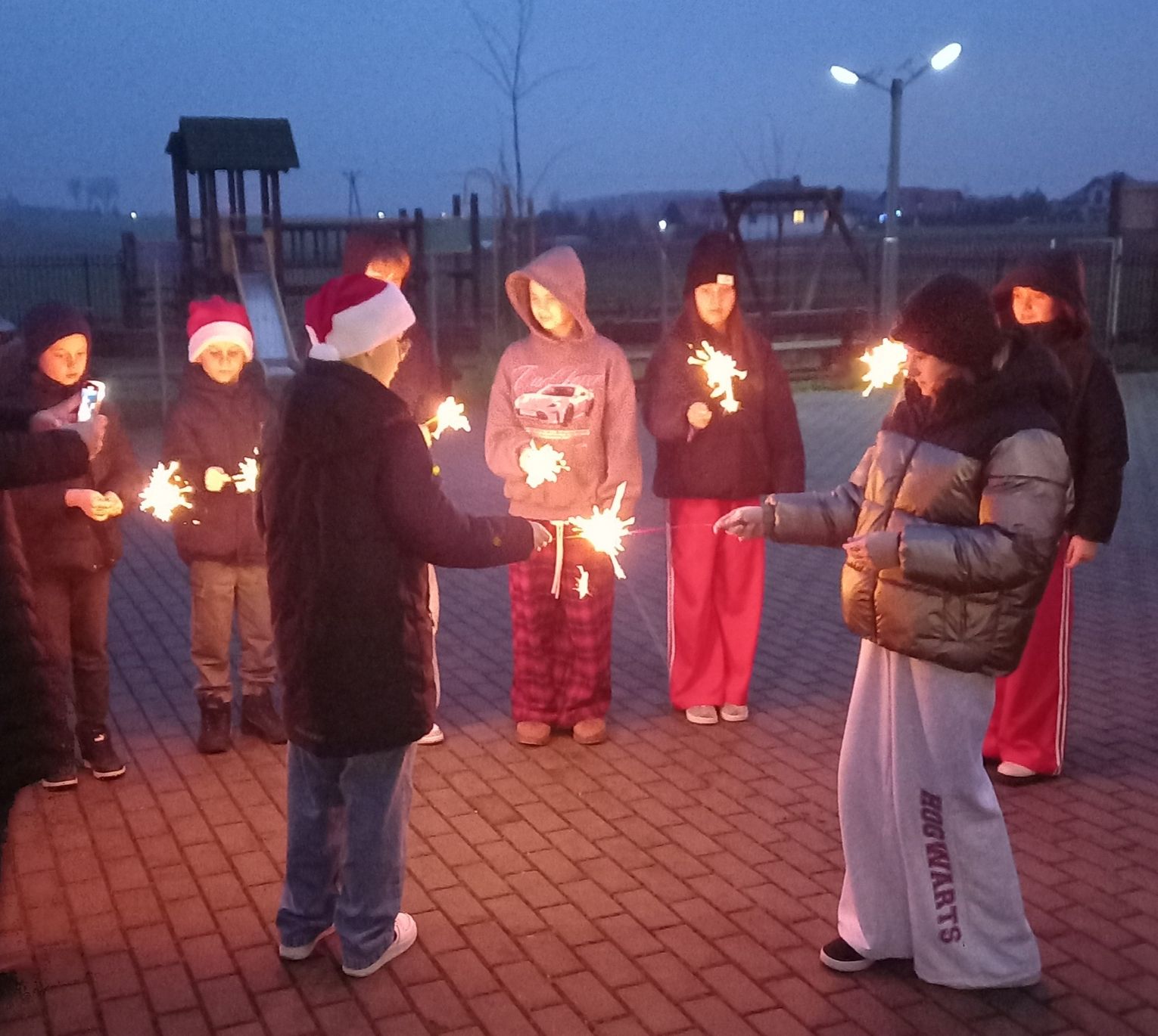 Największą atrakcją był oczywiście Święty Mikołaj, który przybył z workiem prezentów i rozdał paczki dla każdego dziecka. Na zakończenie maluchy odpaliły zimne ognie, tworząc magiczny, świąteczny finał spotkania. Całe wydarzenie przebiegło w ciepłej, radosnej atmosferze i na długo pozostanie w pamięci uczestników.